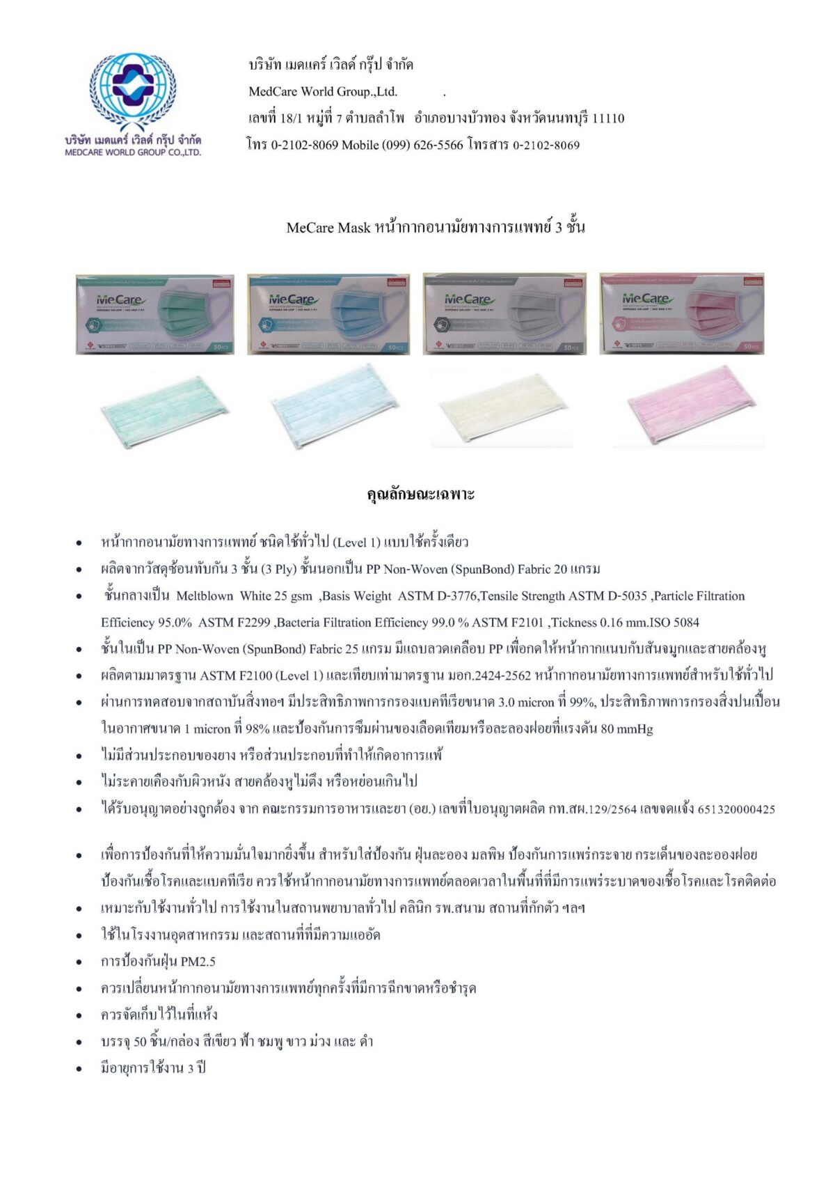 (ยกลัง 50 กล่องส่งฟรี) กล่องละ 39.- MeCare Surgical Mask Earloop 3 Ply หน้ากากแพทย์ 3 ชั้น (50ชิ้น/กล่อง)