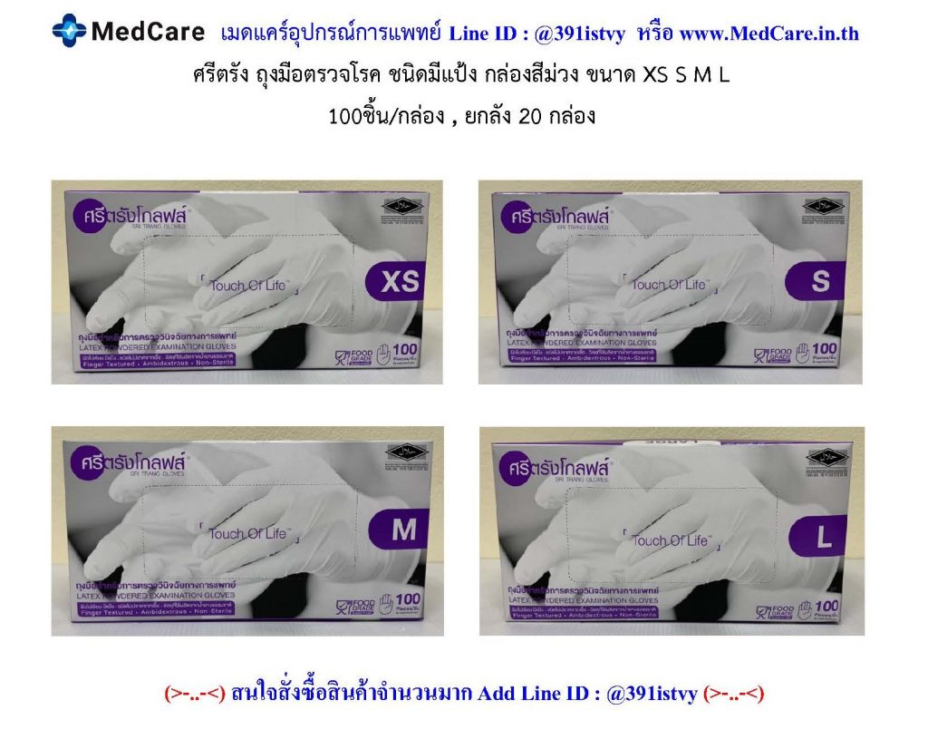 08 มิ.ย. (ยกลัง 40 กล่อง) กล่องละ 99.- + ค่าขนส่งมัดละ 140.- SRI TRANG กล่อง ม่วง ถุงมือตรวจโรค มีแป้ง (100ชิ้น/กล่อง) Continue reading